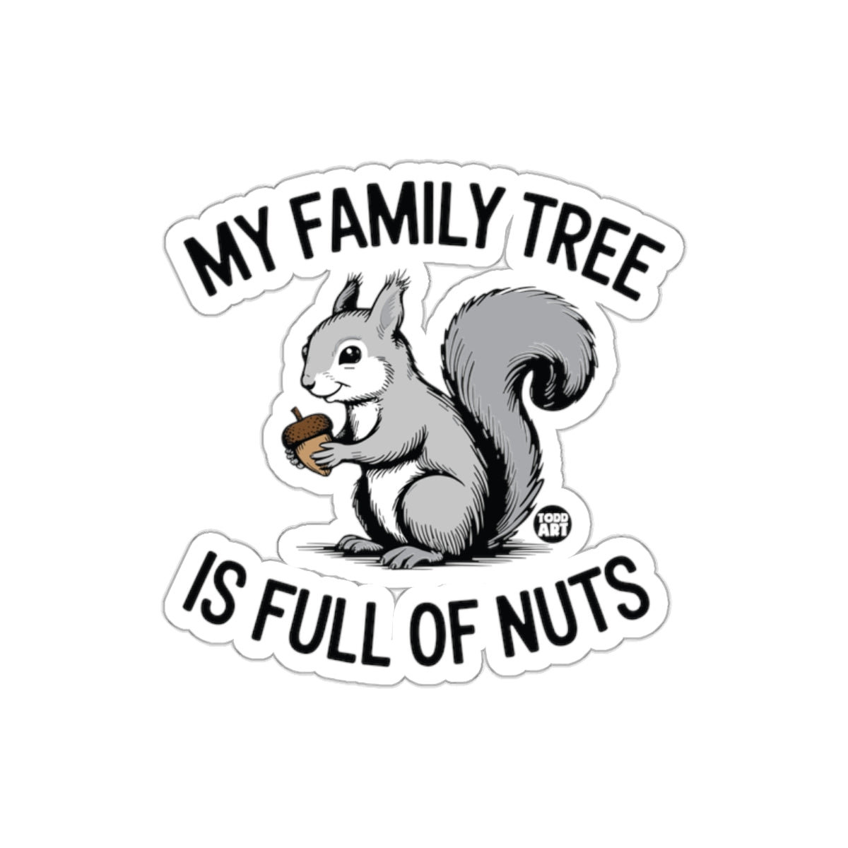 Show your nutty side with this funny squirrel sticker! Featuring a cute squirrel holding an acorn and the phrase "My Family Tree Is Full of Nuts" perfect for adding humor.