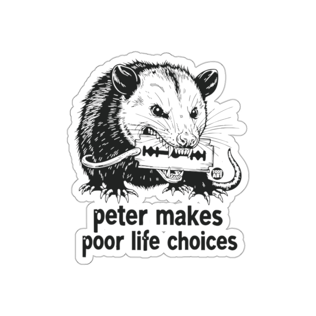 Embrace dark humor with this "Peter Makes Poor Life Choices" opossum sticker! It's perfect for anyone who appreciates quirky art, odd humor, or just loves opossums.