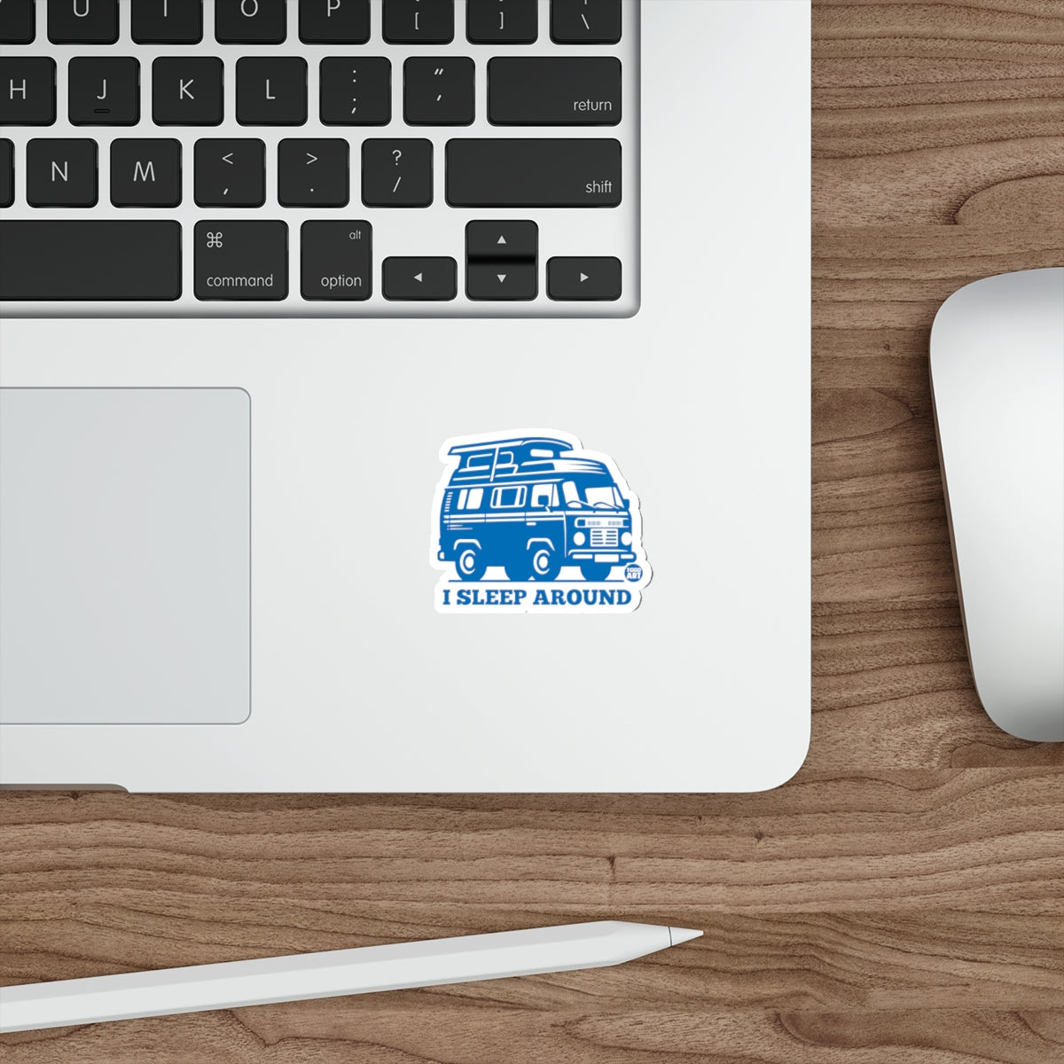 Express your wanderlust with this fun graphic sticker featuring a camper van and the phrase "I Sleep Around". Great for personalizing your belongings with a unique touch. Get yours now!