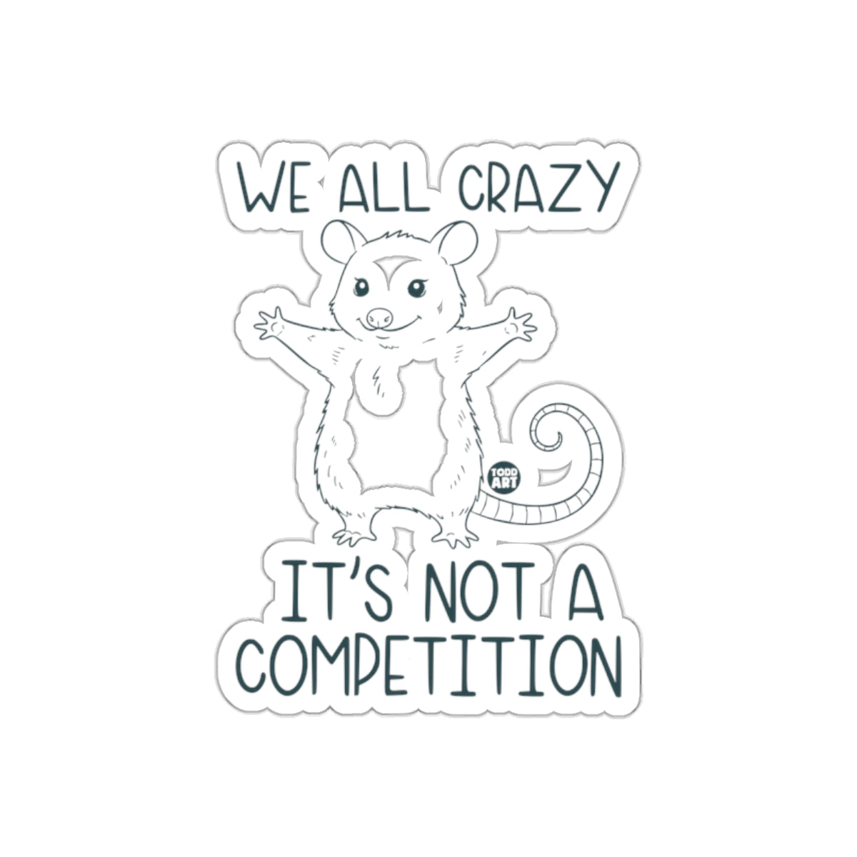 Add a touch of humor to your belongings with this unique opossum sticker! Featuring the funny quote "We All Crazy Its Not A Competition," it is sure to spark smiles and conversation wherever you go.